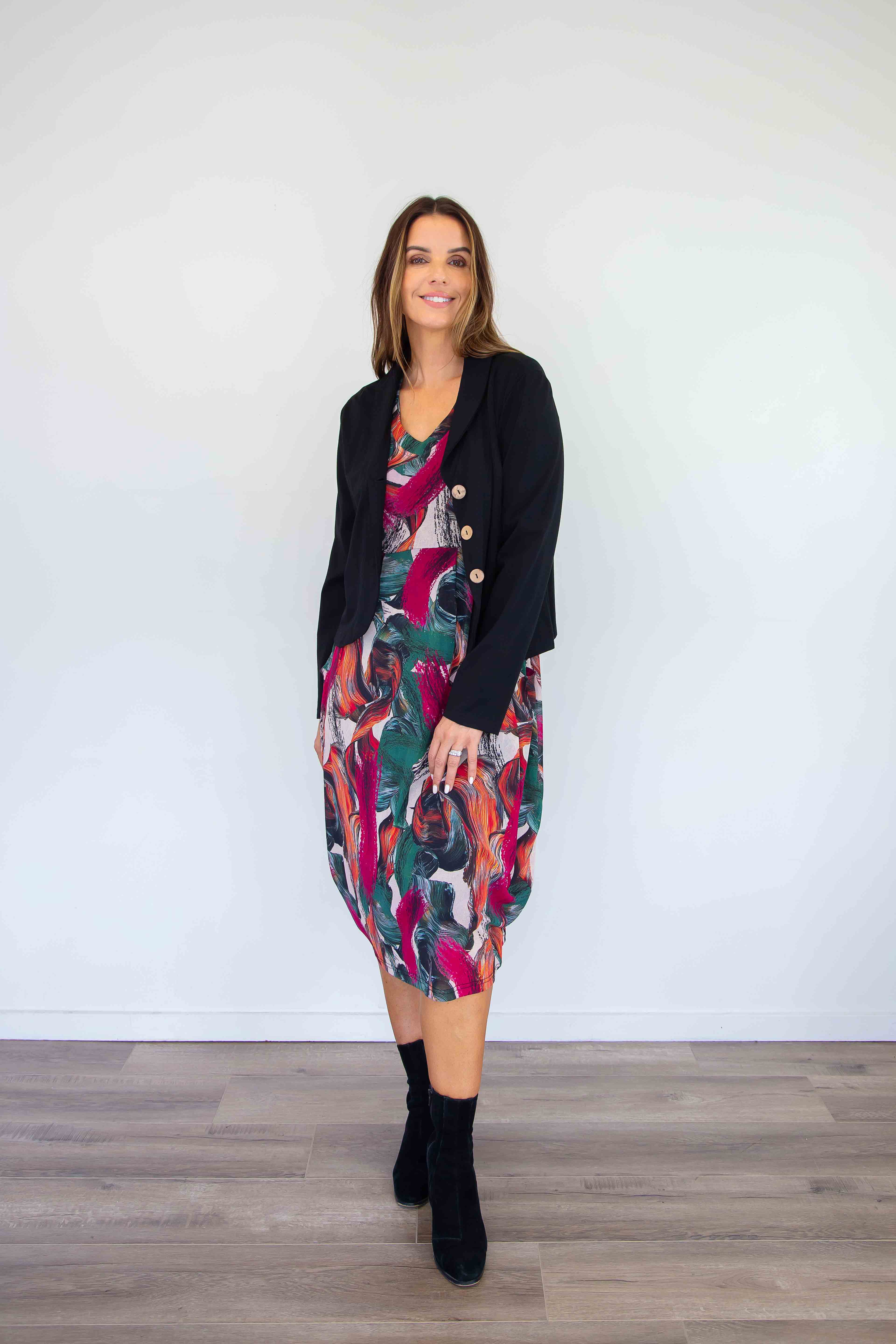 A gorgeous fitted jacket that looks fabulous with skirts, pants, dresses, or jeans. Team the patterned jacket with the matching skirt (style #2685) for a suit look.